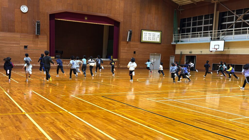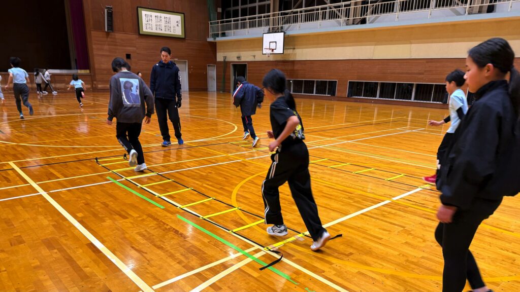 体験者に解りやすく、また在クラブ員の復習も込めて、骨ストレッチをキッチリ教えてからアップしました。続いてメインのミニハードル。そして本日のスペシャルはどんじゃんです。人数の関係で体験の1年生は6年生と同チームに。4組に分かれての対戦、大きな歓声が飛びます。あとは簡単なラダー走で神経系のトレーニングから、最後は変形ダッシュで終了しました。